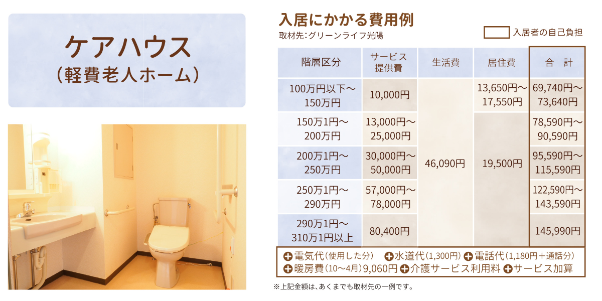 一般型と介護型があり、一般型の場合は住居と食事の提供となり、