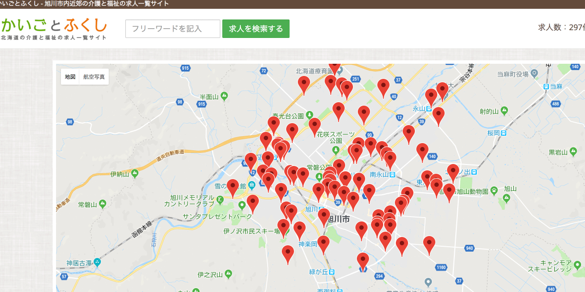 旭川市内・近郊の求人情報の中でも介護・福祉のみの求人を拾い上げ、地図上に表示させる機能を持った「かいごとふくし.info」を公開しました!