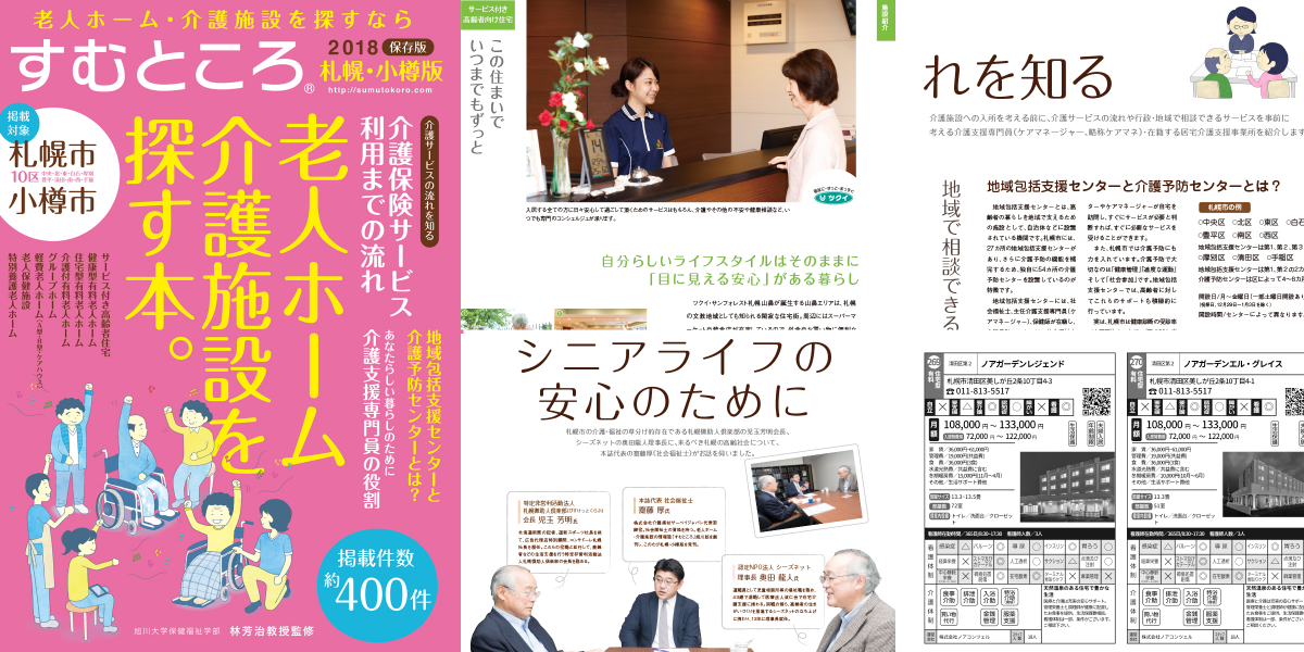 冊子「すむところ」の第三号、札幌・小樽版を11月末に発行致しました。掲載施設は札幌市内を中心に約400件の老人ホーム・介護施設が一覧になっており、探しやすい構成になっております。たくさんの方々のご支援・ご協力により発刊することができました。本当にありがとうございます。